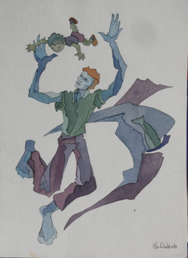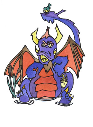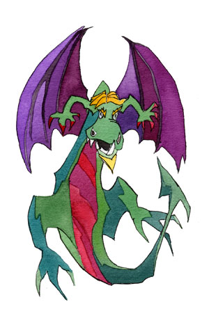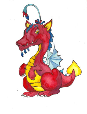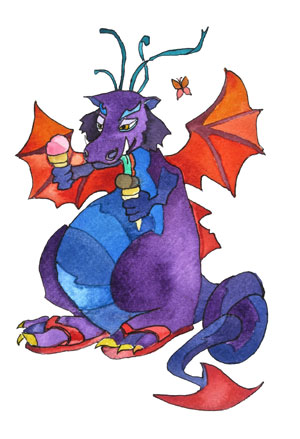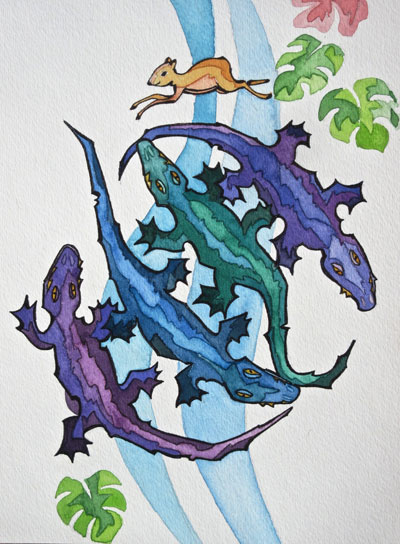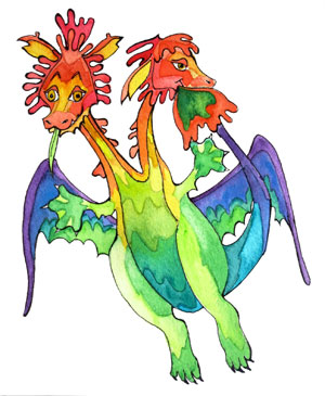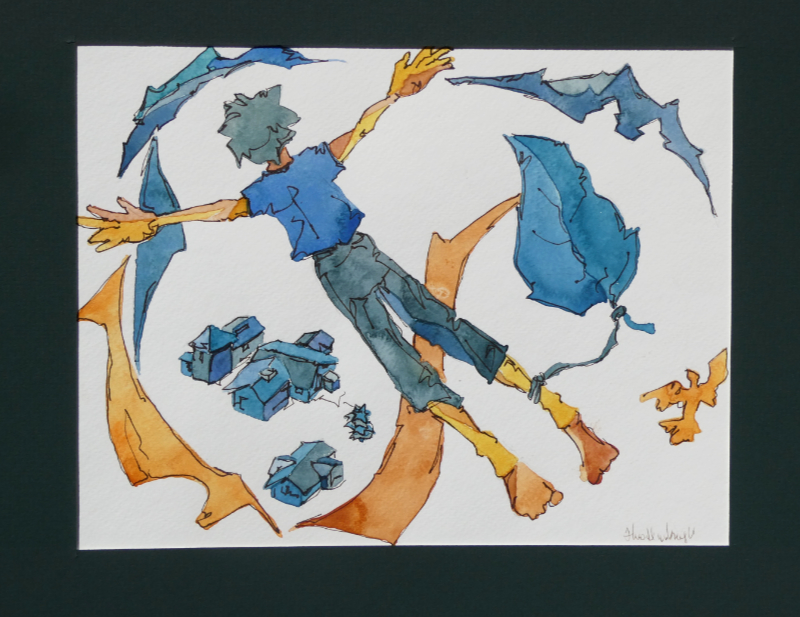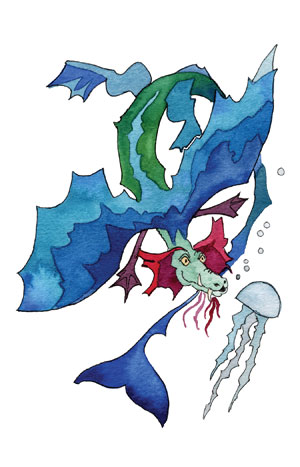 The paintings featured below are all watercolours Theo did as illustrations for his children’s book Finding Dragons (& Driggles), in which each dragon is partnered with its own delightful read-aloud poem. These original paintings, for sale separately, are approximately 7.5 x 11 inches. Each is $125 — or else you can cover the postage for Theo and make your own equivalent donation directly to Doctors without Borders. (The book on amazon is almost free.)