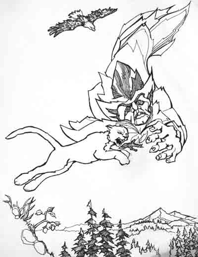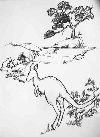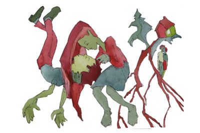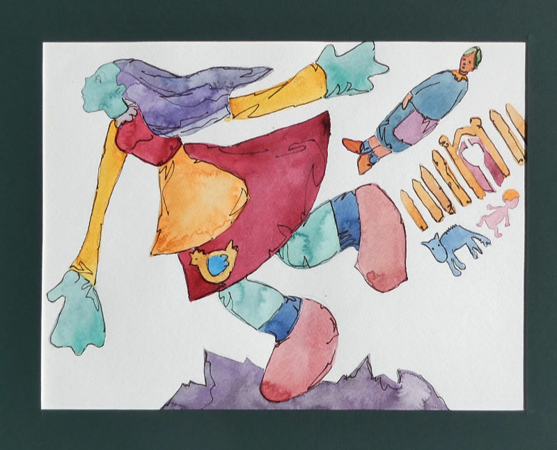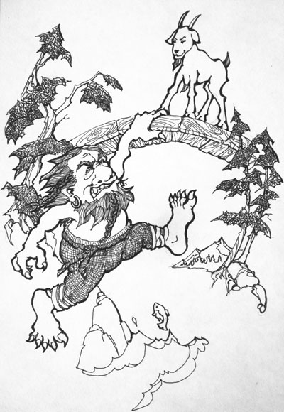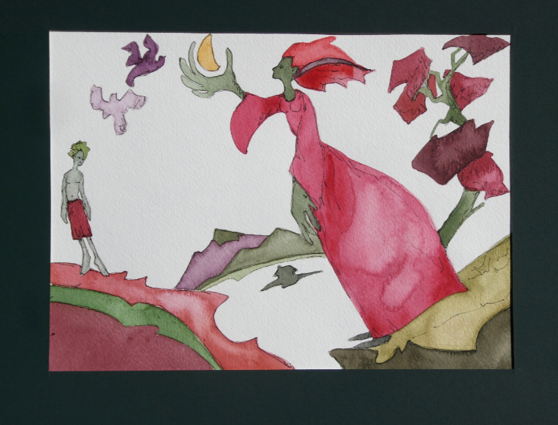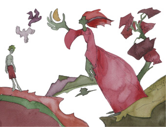 These illustrations were commissioned by a publisher for children’s books and appeared with stories of tricksters and quests. The original drawings are available from Theo for $50+postage each, or else the cost of postage and your own equivalent direct donation to Doctors without Borders.