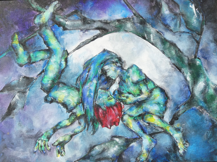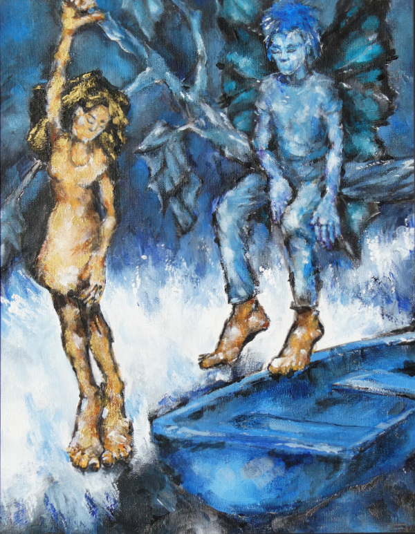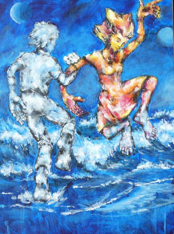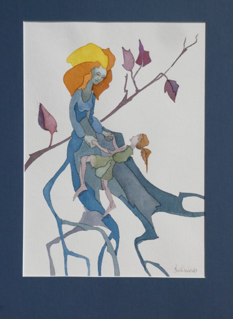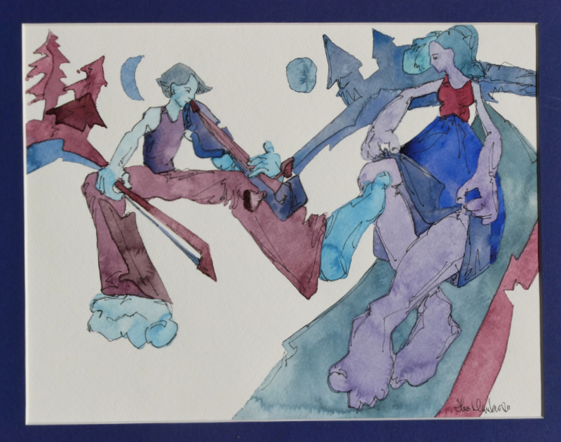 Imaginative and fantastical, the following paintings catch moments of giddy joy, personal interconnection, or reaching (literally) for the moon. Theo’s paintings of this sort have often made good gifts, marking special events or relationships through their associations. Each is easily given your own meaning by a personal story.