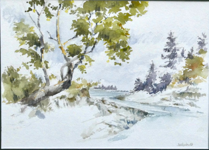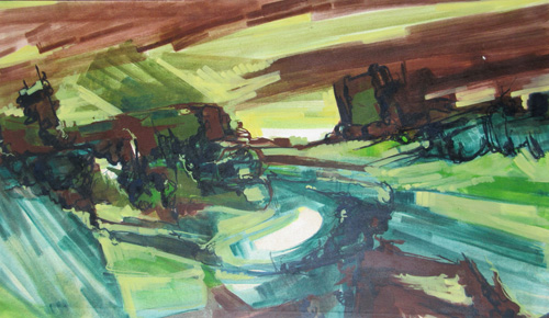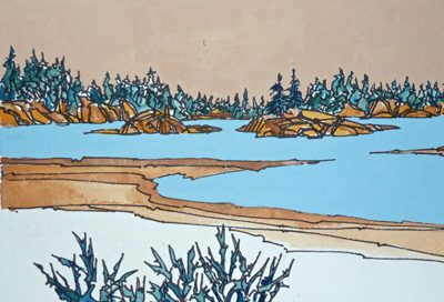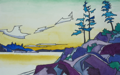 Landscapes and townscapes, filtered by imagination and rendered with different media and techniques: Theo’s paintings of places vary considerably. He did many of his watercolour landscapes, for instance, deliberately to illustrate specific places in his beach and hiking guidebooks, but he veers with other paintings away from likeness into abstract. In addition to landscapes, he has been intrigued by the “scapes” created by people — the streets, rooftops, castles, and architectural forms of old Europe most particularly. When these merge with legend and fantasy, they are presented on this website under Stories.